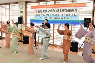 「えちご押上ひすい海岸」を歌い上げる石塚さん(奥)と、合わせて踊る藤間会(手前)