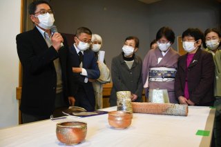講演後、展示品の信楽焼きなどを解説する石黒館長(左)。コロナ禍も明け、茶の湯を楽しむ機会を増やしたいとも願った