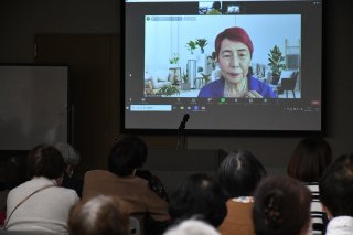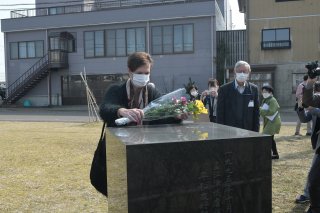 直江津捕虜収容所で死亡したオーストラリア兵の慰霊碑に花を手向けるギルバートさん