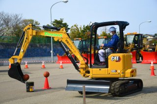 9日に田中産業で開かれた報道向け見学会。今井さんは重機を自在に繰り、精密な作業を次々にこなした