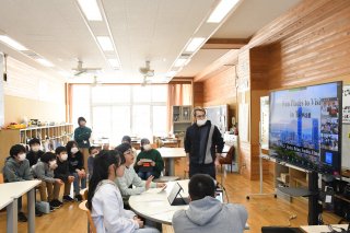 「平和友好像」の前で懇談するメリック会長(中央)ら