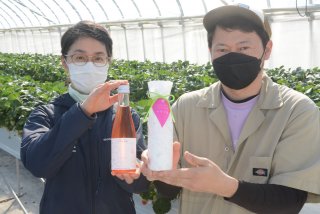 リキュール「いちご花」を手に取る竹田酒造店の竹田さん(左)と「苺の花ことば」の髙橋代表(イチゴハウス内)