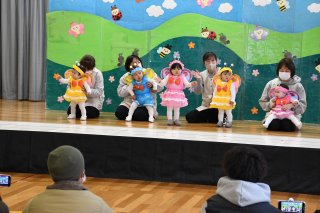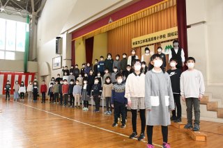 おわかれ会の最後に校歌を歌う児童たち(妙高高原南小)