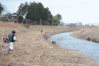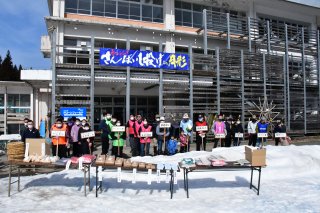 青空の下、残雪のフィールドに「さんばいし」を放つ参加選手