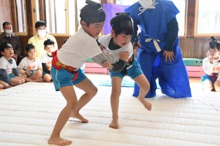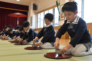 園児が自分でお茶をたて、味わう。真剣に向き合う様子を、保護者が参観した