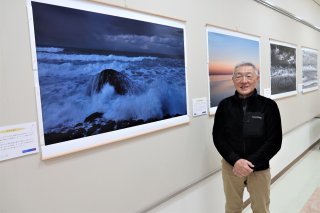 能生から浦本にかけての「海辺の情景」7点を展示している高野さん(4日、ヒスイ王国館で)