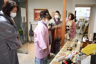 各店舗に飾られた雛人形を鑑賞する参加者(本町3の雅房眞泉)