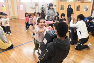 年少児の体験の最後はボールを持ってクッションにタックル。園児たちは積極的にぶつかっていった