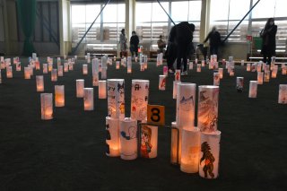 地元小中学生が描いた絵は室内でLEDに照らされた