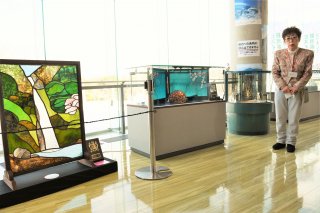 フォッサマグナミュージアムで開かれている藤木節子さん(糸魚川市出身)のステンドグラス展。「不動滝」など故郷を思う作品を紹介