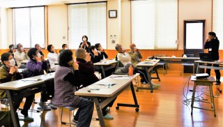 糸魚川市と「大野ゆっくり歩こう会」共催によるフレイル予防教室。口の健康について楽しく学んだ参加者(17日、大野地区公民館)