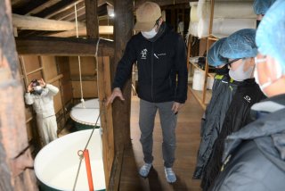 蔵の上からタンク内の発酵の様子を見る児童たち