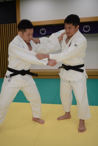 謙信公武道館小道場で稽古に励む川住(左)と丸山両選手