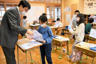 3学期がスタートし、冬休みの宿題などを提出した児童たち(大野小1、2年生)