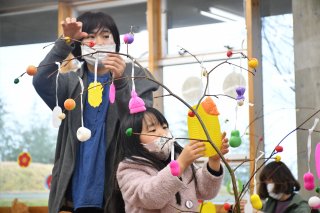 家内安全、五穀豊穣(ほうじょう)などを願う「まゆ玉」飾り作りを体験した