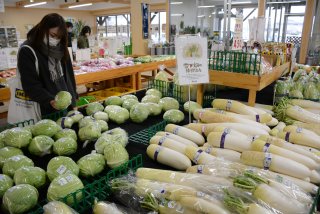 雪の下で糖度を増したダイコンやキャベツなどが並ぶ特設コーナー