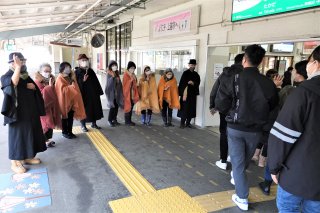 高田駅では「雁木のまち高田おもてなし隊」がお出迎え