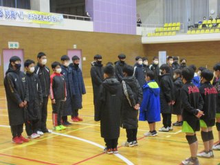 整列した男子6年生は大会運営をサポート。出場選手たちから感謝のあいさつと拍手を受けた