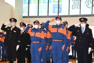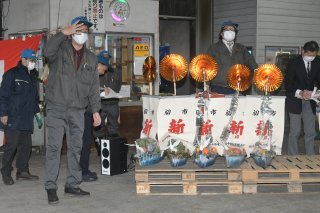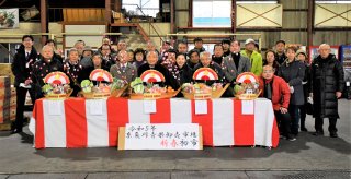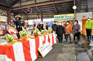 買参人や生産者、来賓ら関係者が集まって開かれた「糸魚川青果卸売市場」の新春初市
