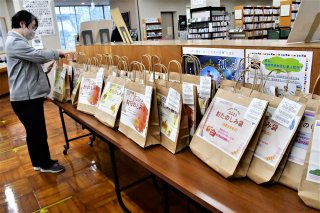 図書館職員の〝おすすめ本〟3冊が入った「おたのしみ袋」(4日午前、市民図書館)
