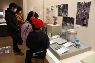 今回充実させた学校生活に関する展示。アルマイト製の盆など、現在は使われなくなった道具などをそろえた