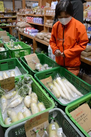 ダイコンをはじめ、七草のおかゆに最適な野菜が並んだ農産物直売所の店頭(6日、四季彩館ひだなん)
