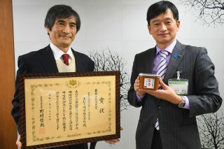青木社長が賞状と最高賞に選ばれた商品とともに中川市長を表敬