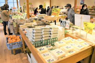 糸魚川産のもち米を使った各種切り餅や山菜水煮、花など正月用品が並ぶ店内(27日、ひすい食彩館)