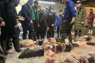 卯(ウサギ)ダイバーが魚たちに餌のお年玉をプレゼント