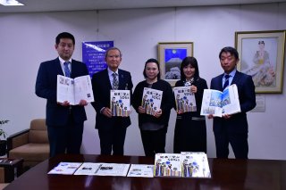 『絵本で学ぶSDGs』を靏本教育長(左から2人目)に託した朝日さん(中央)ら4人