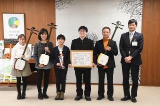 上越市役所を訪れ、入賞を報告。(左から)小竹美咲さん、五十嵐澄子さん、曽根安貴さん、曽根宜樹君、小竹勇生山さん