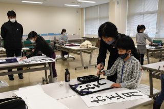 指導者が子どもと一緒に筆を握って書き、筆運びの感覚をつかむ