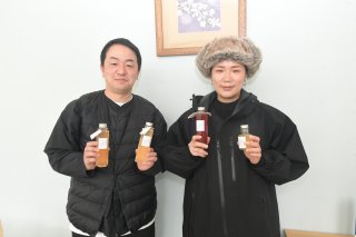 シロップを手にする福井さん(左)と齋藤さん。齋藤さんによると、花を使ったシロップは香りも楽しめるという