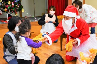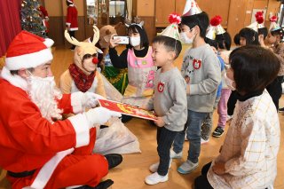 サンタクロースからプレゼントを受け取る園児たち