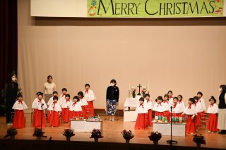 年長児の一部と年中児がケープをまとって聖歌を歌った