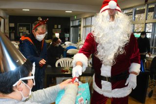主催者代表の藤田さんがサンタに扮して登場。プレゼントを渡した後は、一緒にカラオケも楽しんだ