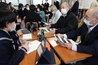 生徒たちの発表内容を踏まえ、机を囲んで意見交換