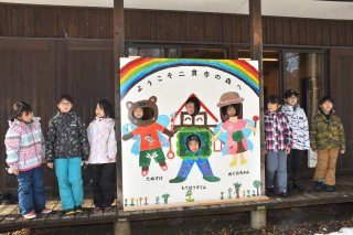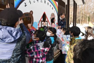顔出しの穴は四つ。設置後に早速、撮影を楽しんだ