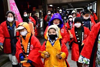 風雨の中、大火被災地を巡回する「火の用心夜回り隊」