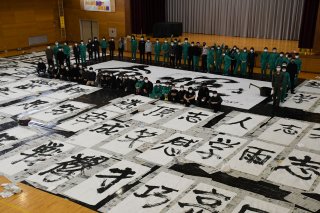 生徒がそれぞれ思いを込めて、一文字の巨大書に挑戦。柳澤さんは超巨大書「命の輝き」を生徒たちに贈った