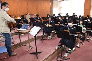 矢澤さん(左)の指導でクラシックギターを体験。コードを覚え、学級全体で1つの曲を合奏した