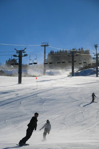 快晴の下で営業を開始したキューピットバレイスキー場。待ちかねたスノーボーダーらが早速、ゲレンデにシュプールを描いていた