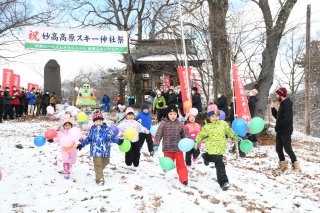 青空の下、雪化粧した斜面を駆け下りる園児たち