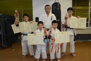 各大会で活躍した柿崎炎心會のメンバー。前列左から重原、鈴木、後列左から長嶺、鈴木館長、田中の各選手(柿崎地区公民館分館内の練習場で)