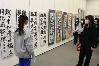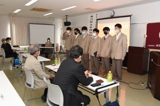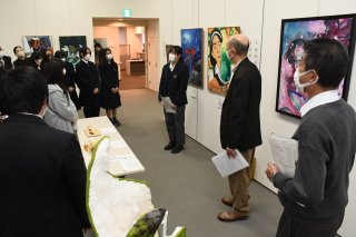美術の鑑賞会の様子。制作した生徒本人が作品を解説し、指導者が講評した