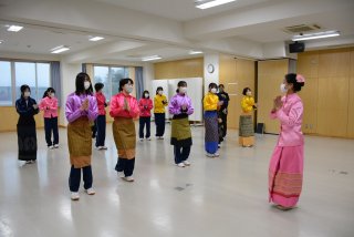中村さん(右)の振り付けをお手本に、タイの衣装を身に着けて踊る生徒