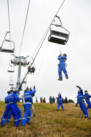 高所でのリフト停止を想定。救助用ポールの使い方や乗客への声掛けなど、実際の救助と同じ形式で学んだ