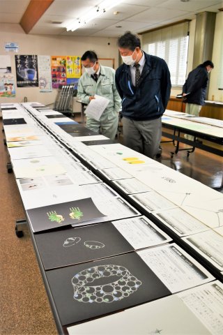 ヒスイをメーンにしたジュエリー、アクセサリーのデザイン画が全国から寄せられ、審査会を前に閲覧が行われた