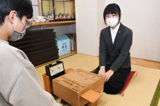 高田将棋同好会の会員と対戦する後藤さん(右)。得意の四間飛車で全国に挑む
