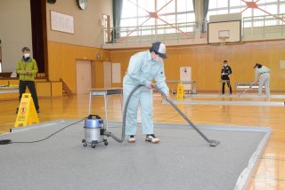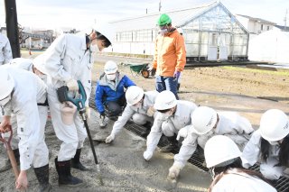 建設業協会上越支部青年部会の指導でコンクリート打設に取り組む生徒たち